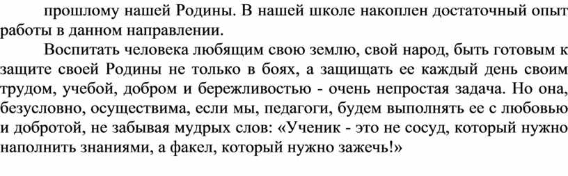 Воспитать человека любящим свою землю, свой народ, быть готовым к защите своей Родины не только в боях, а защищать ее каждый день своим трудом, учебой, добром и бережливостью - очень непростая задача. Но она, безусловно, осуществима, если мы, педагоги, будем выполнять ее с любовью и добротой, не забывая мудрых слов: «Ученик - это не сосуд, который нужно наполнить знаниями, а факел, который нужно зажечь!»
