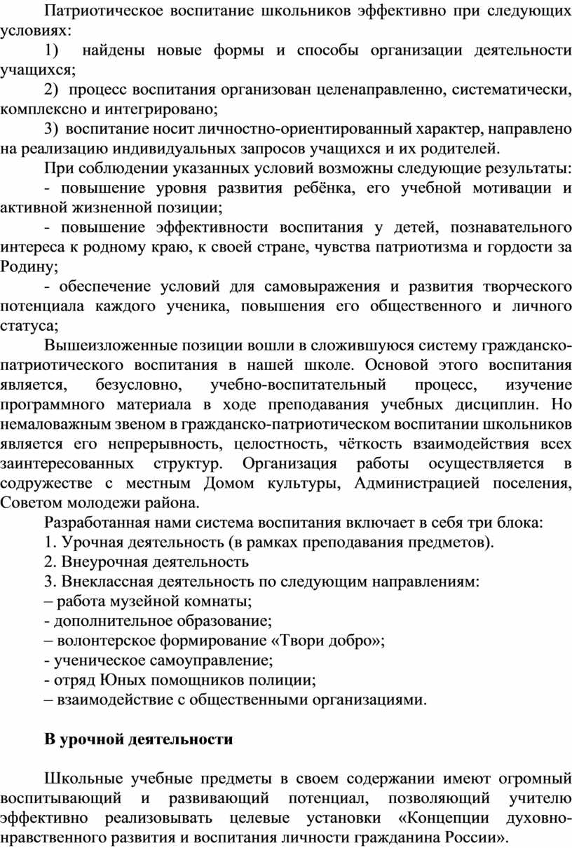Патриотическое воспитание школьников эффективно при следующих условиях: