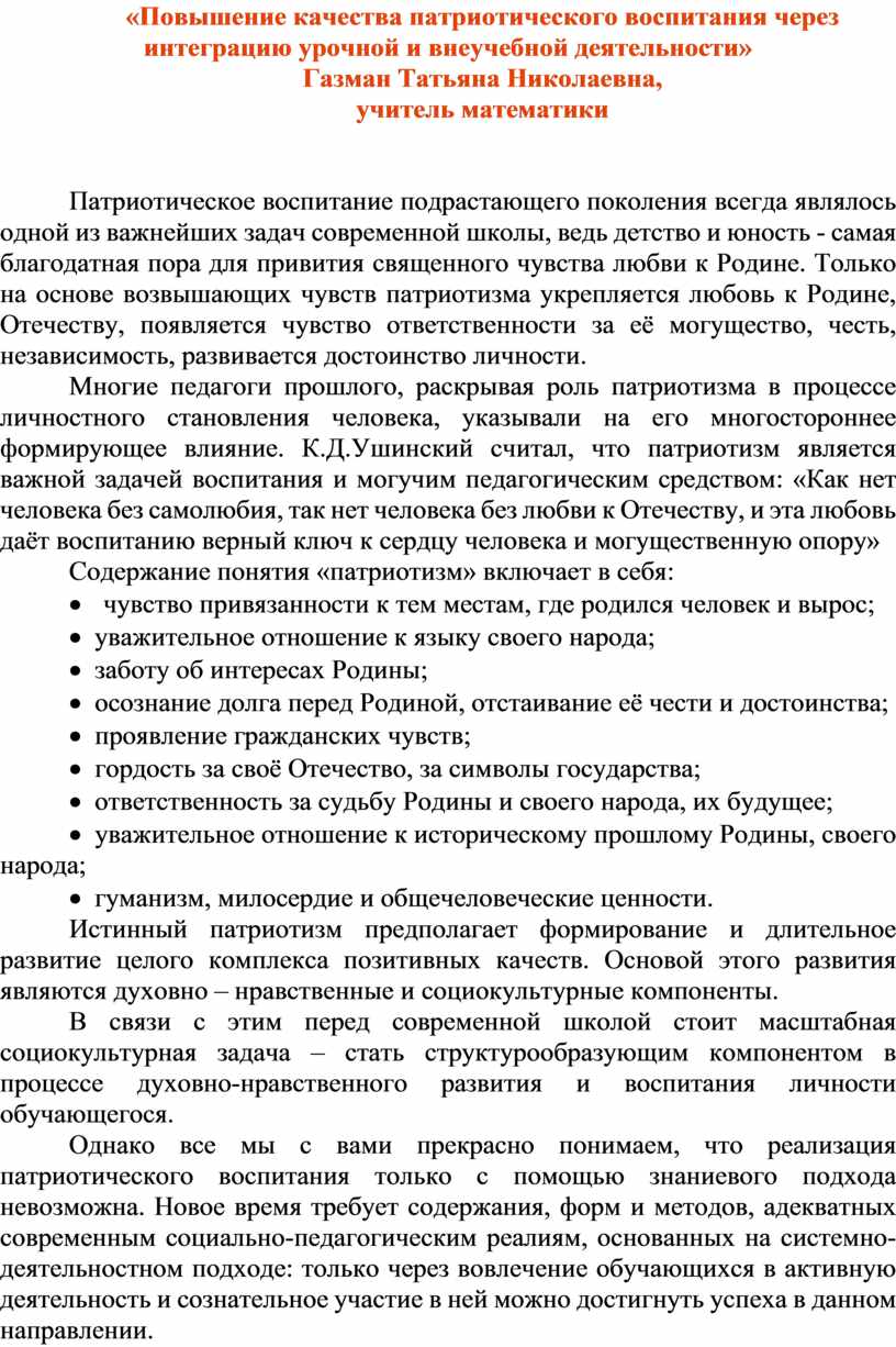 «Повышение качества патриотического воспитания через интеграцию урочной и внеучебной деятельности»