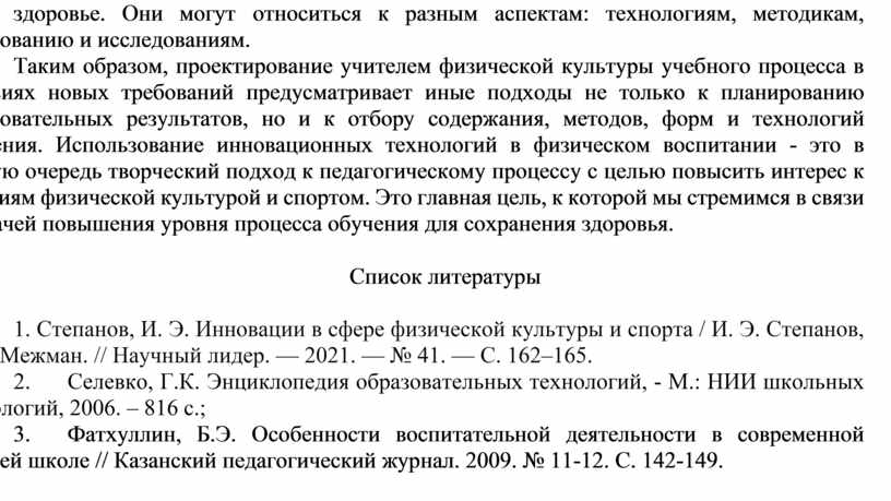 Таким образом, проектирование учителем физической культуры учебного процесса в условиях новых требований предусматривает иные подходы не только к планированию образовательных результатов, но и к отбору содержания, методов, форм и технологий обучения. Использование инновационных технологий в физическом воспитании - это в первую очередь творческий подход к педагогическому процессу с целью повысить интерес к занятиям физической культурой и спортом. Это главная цель, к которой мы стремимся в связи с задачей повышения уровня процесса обучения для сохранения здоровья.