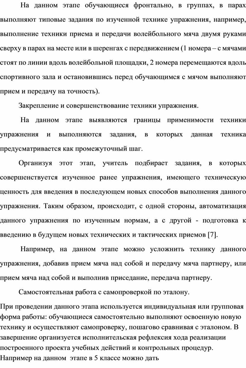 На да нн ом эт ап е об уч аю щи ес я фр он та ль но , в гр уп па х, в па ра х вы по лн яю т ти по вы е за да ни я по из уч ен но й те хн ик е уп ра жн ен ия , на пр им ер , вы по лн ен ие те хн ик и пр ие ма и пе ре да чи во ле йб ол ьн ог о мя ча дв ум я ру ка ми св ер ху в па ра х на ме ст е ил и в ше ре нг ах с пе ре дв иж ен ие м (1 но ме ра – с мя ча ми ст оя т по ли ни и вд ол ь во ле йб ол ьн ой пл ощ ад ки , 2 но ме ра пе ре ме ща ют ся вд ол ь сп ор ти вн ог о за ла и ос та но ви вш ис ь пе ре д об уч аю щи мс я с мя чо м вы по лн яю т пр ие м и пе ре да чу на то чн ос ть ).