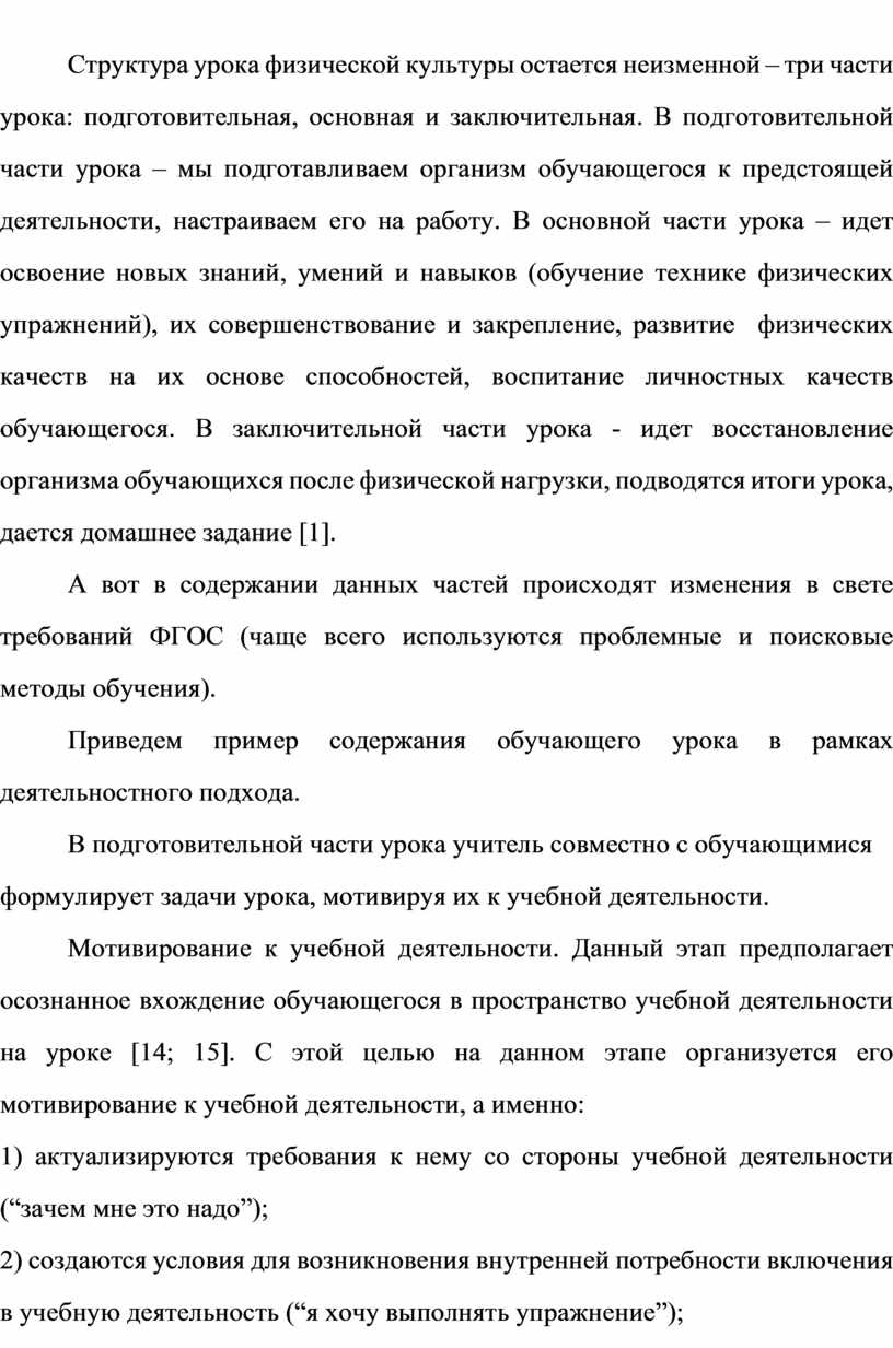 Ст ру кт ур а ур ок а фи зи че ск ой ку ль ту ры ос та ет ся не из ме нн ой – тр и ча ст и ур ок а: по дг от ов ит ел ьн ая , ос но вн ая и за кл юч ит ел ьн ая . В по дг от ов ит ел ьн ой ча ст и ур ок а – мы по дг от ав ли ва ем ор га ни зм об уч аю ще го ся к пр ед ст оя ще й де ят ел ьн ос ти , на ст ра ив ае м ег о на ра бо ту . В ос но вн ой ча ст и ур ок а – ид ет ос во ен ие но вы х зн ан ий , ум ен ий и на вы ко в (об уч ен ие те хн ик е фи зи че ск их уп ра жн ен ий ), их со ве рш ен ст во ва ни е и за кр еп ле ни е, ра зв ит ие фи зи че ск их ка че ст в на их ос но ве сп ос об но ст ей , во сп ит ан ие ли чн ос тн ых ка че ст в об уч аю ще го ся . В за кл юч ит ел ьн ой ча ст и ур ок а - ид ет во сс та но вл ен ие ор га ни зм а об уч аю щи хс я по сл е фи зи че ск ой на гр уз ки , по дв од ят ся ит ог и ур ок а, да ет ся до ма шн ее за да ни е [1].