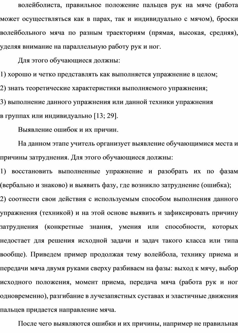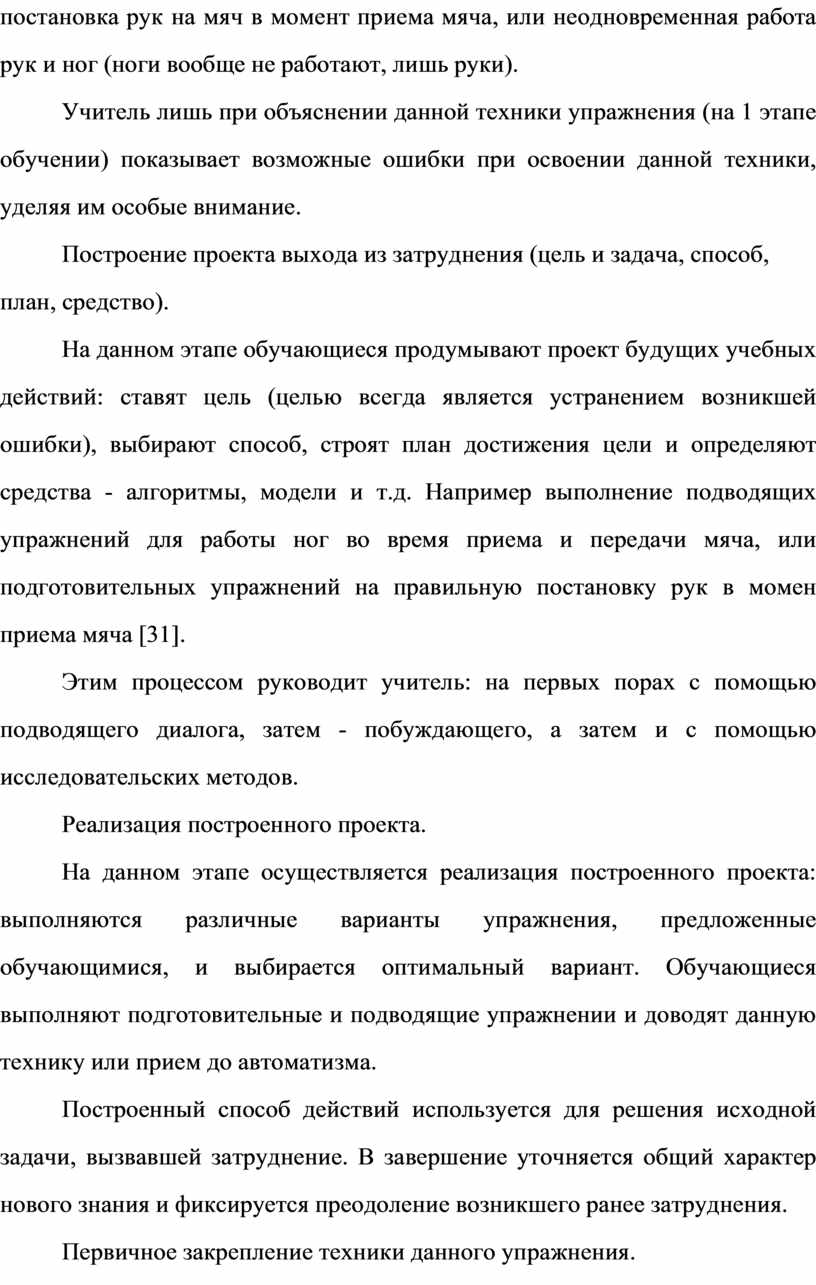 2) со от не ст и св ои де йс тв ия с ис по ль зу ем ым сп ос об ом вы по лн ен ия да нн ог о уп ра жн ен ия (те хн ик ой ) и на эт ой ос но ве вы яв ит ь и за фи кс ир ов ат ь пр ич ин у за тр уд не ни я (ко нк ре тн ые зн ан ия , ум ен ия ил и сп ос об но ст и, ко то ры х не до ст ае т дл я ре ше ни я ис хо дн ой за да чи и за да ч та ко го кл ас са ил и ти па во об ще ). Пр ив ед ем пр им ер пр од ол жа я те му во ле йб ол а, те хн ик у пр ие ма и пе ре да чи мя ча дв ум я ру ка ми св ер ху ра зб ив ае м на фа зы : вы хо д к мя чу , вы бо р