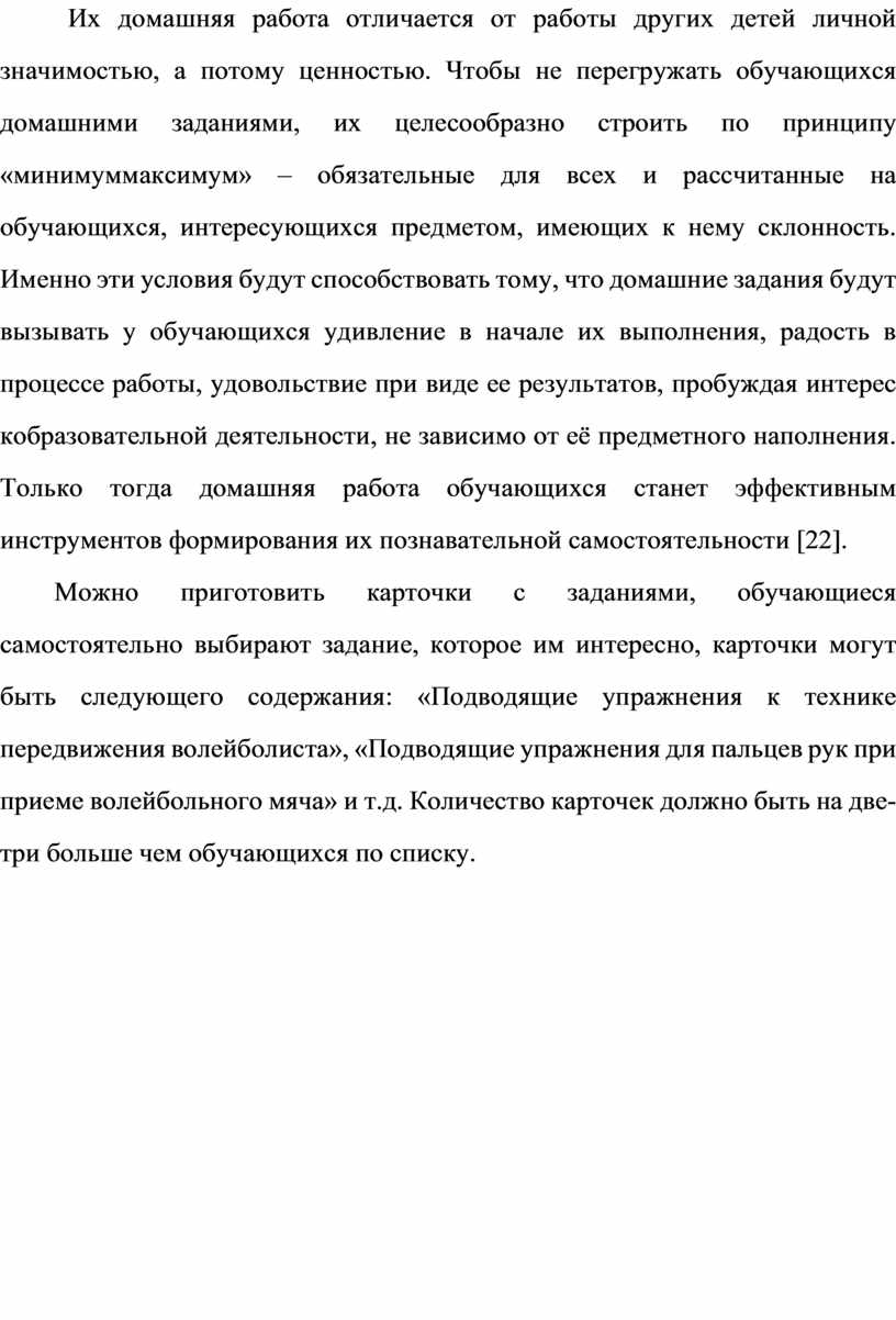 Их до ма шн яя ра бо та от ли ча ет ся от ра бо ты др уг их де те й ли чн ой зн ач им ос ть ю, а по то му це нн ос ть ю. Чт об ы не пе ре гр уж ат ь об уч аю щи хс я до ма шн им и за да ни ям и, их це ле со об ра зн о ст ро ит ь по пр ин ци пу «ми ни му мм ак си му м» – об яз ат ел ьн ые дл я вс ех и ра сс чи та нн ые на об уч аю щи хс я, ин те ре су ющ их ся пр ед ме то м, им ею щи х к не му ск ло нн ос ть . Им ен но эт и ус ло ви я бу ду т сп ос об ст во ва ть то му , чт о до ма шн ие за да ни я бу ду т вы зы ва ть у об уч аю щи хс я уд ив ле ни е в на ча ле их вы по лн ен ия , ра до ст ь в пр оц ес се ра бо ты , уд ов ол ьс тв ие пр и ви де ее ре зу ль та то в, пр об уж да я ин те ре с ко бр аз ов ат ел ьн ой де ят ел ьн ос ти , не за ви си мо от её пр ед ме тн ог о на по лн ен ия . То ль ко то гд а до ма шн яя ра бо та об уч аю щи хс я ст ан ет эф фе кт ив ны м ин ст ру ме нт ов фо рм ир ов ан ия их по зн ав ат ел ьн ой са мо ст оя те ль но ст и [22].