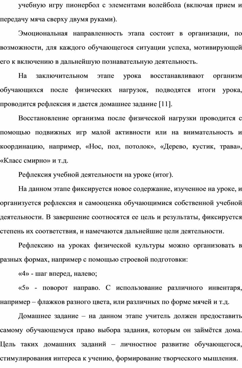 На за кл юч ит ел ьн ом эт ап е ур ок а во сс та на вл ив аю т ор га ни зм об уч аю щи хс я по сл е фи зи че ск их на гр уз ок , по дв од ят ся ит ог и ур ок а, пр ов од ит ся ре фл ек си я и да ет ся до ма шн ее за да ни е [11].