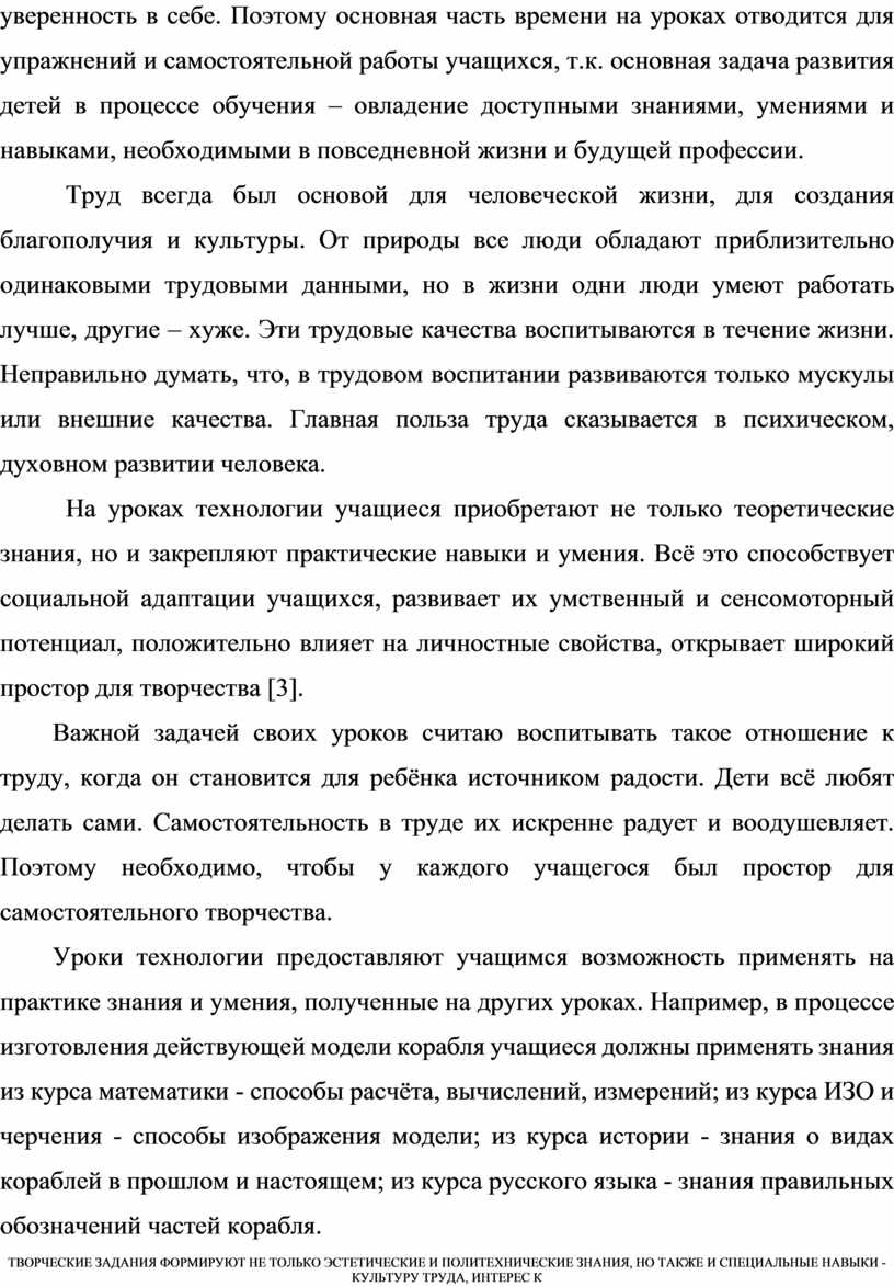 Творческие задания формируют не только эстетические и политехнические знания, но также и специальные навыки - культуру труда, интерес к творческому процессу, приучат доводить начатое дело до конца, будут способствовать развитию ловкости сноровки, воспитанию уважения к труду.