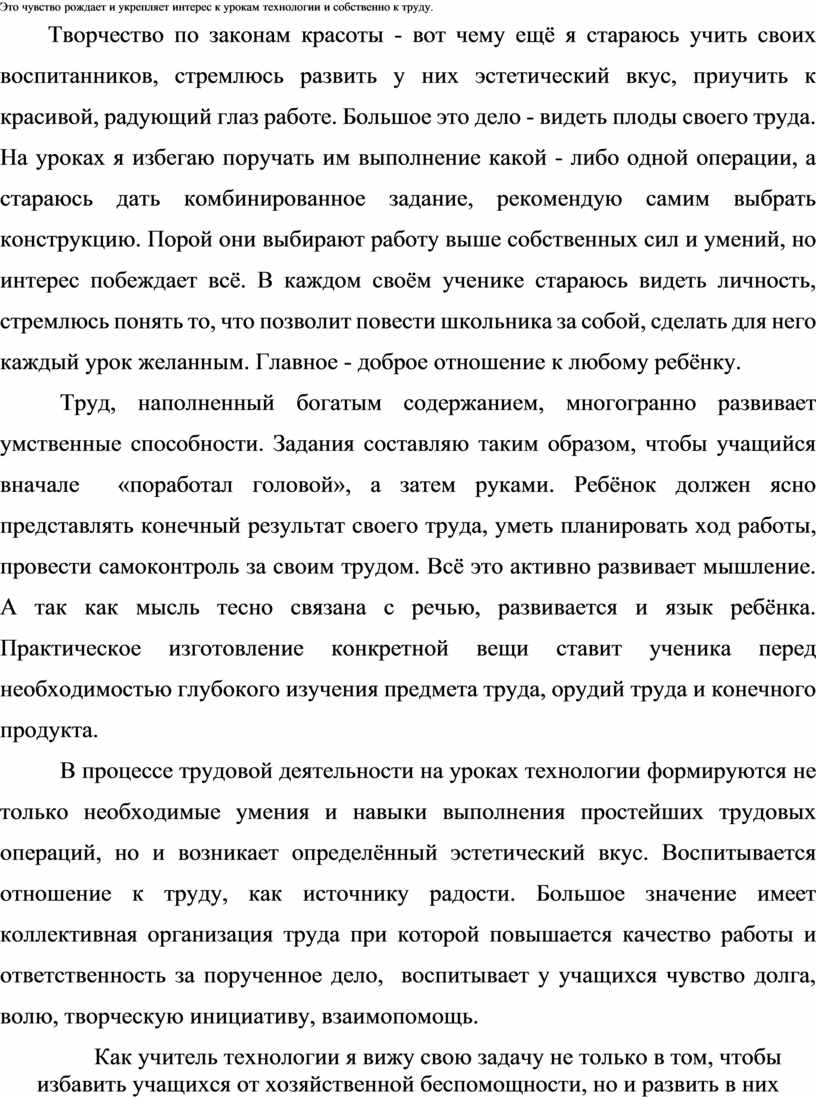 Творчество по законам красоты - вот чему ещё я стараюсь учить своих воспитанников, стремлюсь развить у них эстетический вкус, приучить к красивой, радующий глаз работе. Большое это дело - видеть плоды своего труда. На уроках я избегаю поручать им выполнение какой - либо одной операции, а стараюсь дать комбинированное задание, рекомендую самим выбрать конструкцию. Порой они выбирают работу выше собственных сил и умений, но интерес побеждает всё. В каждом своём ученике стараюсь видеть личность, стремлюсь понять то, что позволит повести школьника за собой, сделать для него каждый урок желанным. Главное - доброе отношение к любому ребёнку.