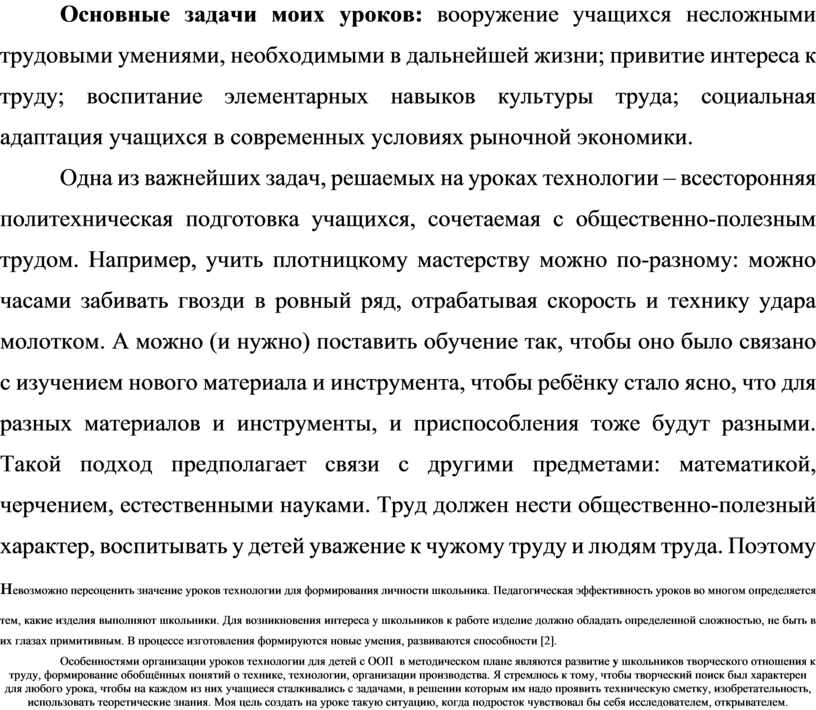 Одна из важнейших задач, решаемых на уроках технологии – всесторонняя политехническая подготовка учащихся, сочетаемая с общественно-полезным трудом. Например, учить плотницкому мастерству можно по-разному: можно часами забивать гвозди в ровный ряд, отрабатывая скорость и технику удара молотком. А можно (и нужно) поставить обучение так, чтобы оно было связано с изучением нового материала и инструмента, чтобы ребёнку стало ясно, что для разных материалов и инструменты, и приспособления тоже будут разными. Такой подход предполагает связи с другими предметами: математикой, черчением, естественными науками. Труд должен нести общественно-полезный характер, воспитывать у детей уважение к чужому труду и людям труда. Поэтому невозможно переоценить значение уроков технологии для формирования личности школьника. Педагогическая эффективность уроков во многом определяется тем, какие изделия выполняют школьники. Для возникновения интереса у школьников к работе изделие должно обладать определенной сложностью, не быть в их глазах примитивным. В процессе изготовления формируются новые умения, развиваются способности [2].
