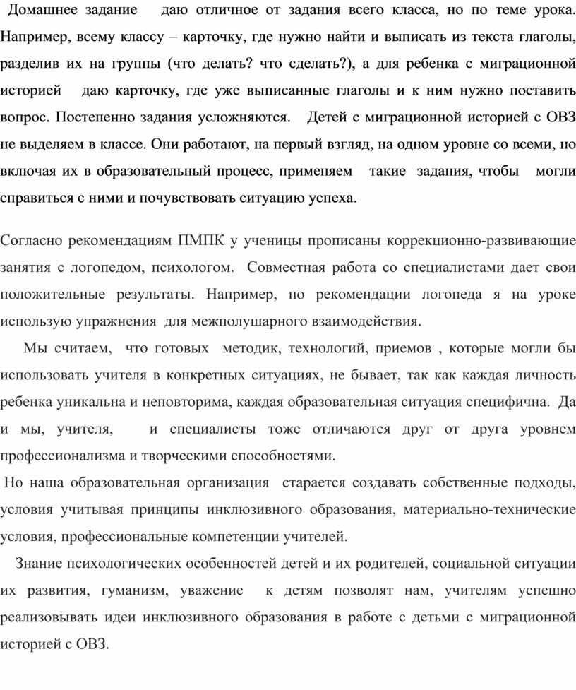 Знание психологических особенностей детей и их родителей, социальной ситуации их развития, гуманизм, уважение к детям позволят нам, учителям успешно реализовывать идеи инклюзивного образования в работе с детьми с миграционной историей с ОВЗ.