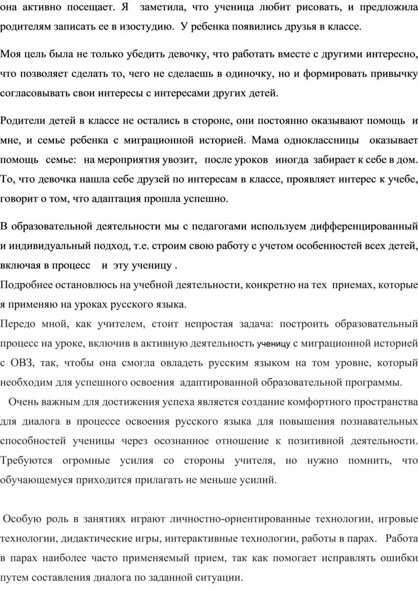 Очень важным для достижения успеха является создание комфортного пространства для диалога в процессе освоения русского языка для повышения познавательных способностей ученицы через осознанное отношение к позитивной деятельности. Требуются огромные усилия со стороны учителя, но нужно помнить, что обучающемуся приходится прилагать не меньше усилий.