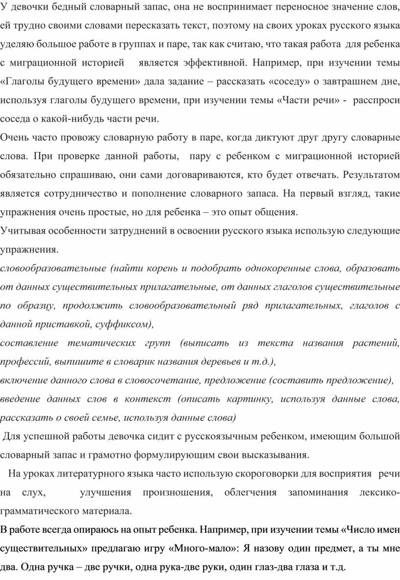 У девочки бедный словарный запас, она не воспринимает переносное значение слов, ей трудно своими словами пересказать текст, поэтому на своих уроках русского языка уделяю большое работе в группах и паре, так как считаю, что такая работа для ребенка с миграционной историей является эффективной. Например, при изучении темы «Глаголы будущего времени» дала задание – рассказать «соседу» о завтрашнем дне, используя глаголы будущего времени, при изучении темы «Части речи» - расспроси соседа о какой-нибудь части речи.