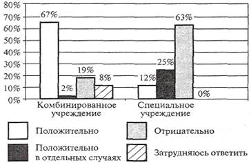 Более сдержанной оказалась оценка педагогами эффективности воспитания детей в условиях смешанной группы (60,4% педагогов считают такую форму воспитания эффективной). Процент противников увеличился почти в 2,5 раза, он составил 16,1% против 6,7%. Как и в случае полной интеграции, наиболее позитивно к данной форме обучения относятся педагоги массовых дошкольных групп и классов комбинированных учреждений (73% случаев). Отношения педагогов массовых учреждений не изменилось - они считают эти две формы эффективными в 65% случаев. Позиция сурдопедагогов специальных учреждений принципиально отличается от отношения сурдопедагогов комбинированных учреждений. Они считают данную форму эффективной лишь в 17% случаев (против 67%) и неэффективной в 50% случаев (против 3%).