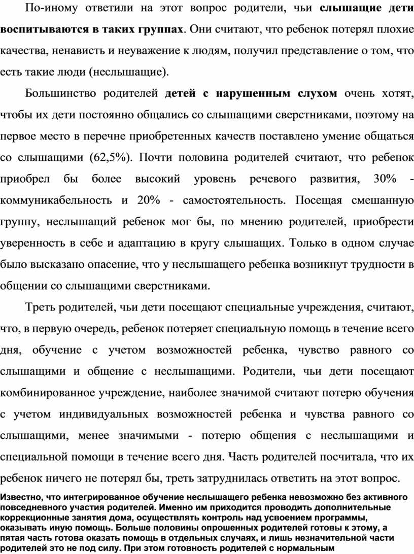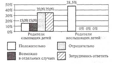 Основными противниками интегрированного обучения всегда выступали неслышащие родители. Мы с радостью констатировали позитивные изменения в этом плане: лишь 15,2% неслышащих родителей возражают против интеграции, что является результатом целенаправленной работы, проводящейся в последние десятилетия.