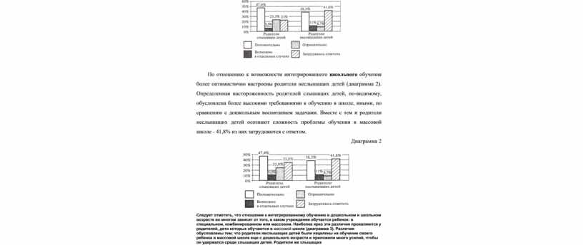 В целом педагоги положительно относятся к совместному обучению детей с нормальным и нарушенным слухом. При этом наиболее позитивно интегрированное обучение оценивают педагоги комбинированных учреждений, уже вовлеченные в него, более настороженно - педагоги массовых учреждений. Родители в целом относятся к интегрированному обучению более настороженно, чем педагоги массовых и комбинированных учреждений. При этом позиция родителей слышащих детей сближается с позицией педагогов, работающих в массовых учреждениях. Особую позицию занимают педагоги специальных учреждений: среди них наибольшее количество противников совместного обучения. Они меньше знают о положительном опыте обучения детей в условиях интеграции и часто сталкиваются с последствиями неорганизованной интеграции.