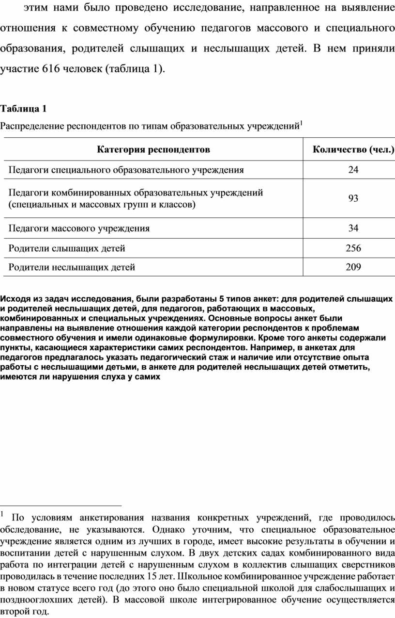 [1] По условиям анкетирования названия конкретных учреждений, где проводилось обследование, не указываются. Однако уточним, что специальное образовательное учреждение является одним из лучших в городе, имеет высокие результаты в обучении и воспитании детей с нарушенным слухом. В двух детских садах комбинированного вида работа по интеграции детей с нарушенным слухом в коллектив слышащих сверстников проводилась в течение последних 15 лет. Школьное комбинированное учреждение работает в новом статусе всего год (до этого оно было специальной школой для слабослышащих и позднооглохших детей). В массовой школе интегрированное обучение осуществляется второй год.