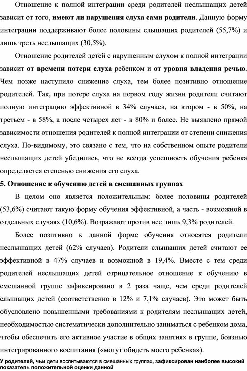 Отношение родителей детей с нарушенным слухом к полной интеграции зависит от времени потери слуха ребенком и от уровня владения речью. Чем позже наступило снижение слуха, тем более позитивно отношение родителей. Так, при потере слуха на первом году жизни родители считают полную интеграцию эффективной в 34% случаев, на втором - в 50%, на третьем - в 58%, а после четырех лет - в 80% и более. Не выявлено прямой зависимости отношения родителей к полной интеграции от степени снижения слуха. По-видимому, это связано с тем, что на собственном опыте родители неслышащих детей убедились, что не всегда успешность обучения ребенка определяется степенью снижения его слуха.