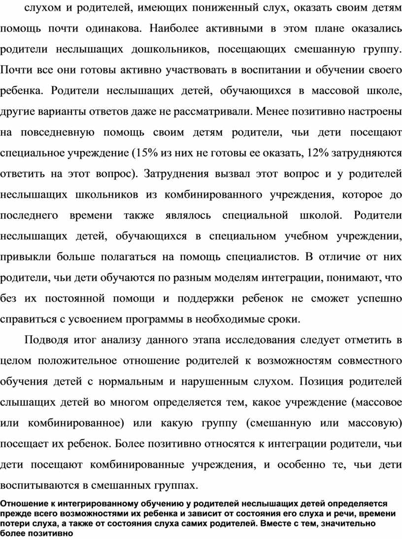 Отношение к интегрированному обучению у родителей неслышащих детей определяется прежде всего возможностями их ребенка и зависит от состояния его слуха и речи, времени потери слуха, а также от состояния слуха самих родителей. Вместе с тем, значительно более позитивно относятся к интеграции те родители, чьи дети воспитываются в комбинированном учреждении или обучаются в массовой школе.