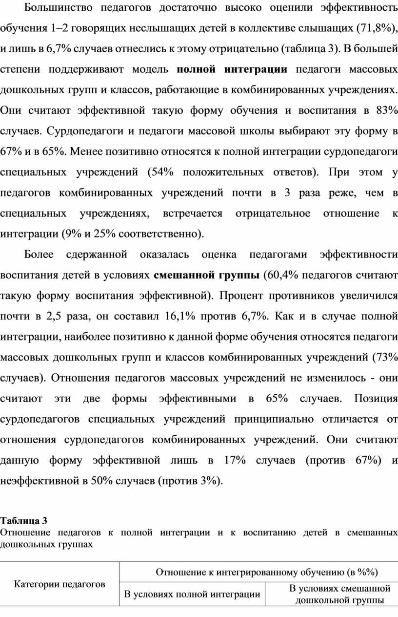 Практически все сурдопедагоги, работающие в настоящее время в комбинированных учреждениях, имеют большой опыт обучения детей с нарушенным слухом в условиях специальных детских садов и школ. Выявленные различия в позиции обусловлены тем, что эти педагоги в процессе целенаправленной работы по интеграции детей с нормальным и нарушенным слухом убедились в ее результативности. Педагоги, обучающие детей в специальном детском саду или школе, с одной стороны, мало знают о результатах обучения детей в условиях специально организованного интегрированного воспитания и обучения, а, с другой стороны, именно они часто сталкиваются с отрицательным опытом неорганизованной интеграции, при которой неслышащий ребенок посещает массовое учреждение не по рекомендации специалистов, а лишь по желанию родителей. Педагоги специальных учреждений неоднократно принимали на обучение неговорящих детей, которые в течение нескольких лет находились в массовых дошкольных или школьных учреждениях.