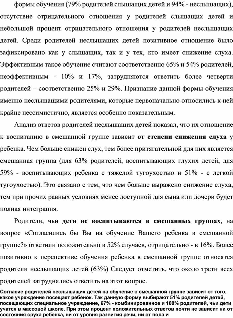 Подводя итог анализу данного этапа исследования следует отметить в целом положительное отношение родителей к возможностям совместного обучения детей с нормальным и нарушенным слухом. Позиция родителей слышащих детей во многом определяется тем, какое учреждение (массовое или комбинированное) или какую группу (смешанную или массовую) посещает их ребенок. Более позитивно относятся к интеграции родители, чьи дети посещают комбинированные учреждения, и особенно те, чьи дети воспитываются в смешанных группах.