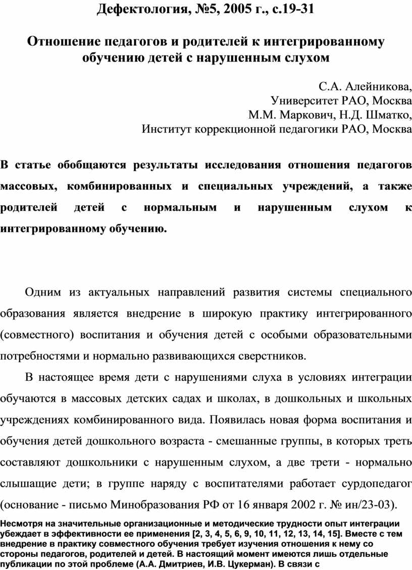 5. Дорофеева И.И., Гиндина Е.А., Теплоухова И.А., Лосева Л.Л. Из опыта работы по интеграции детей с нарушенным слухом // Дефектология. - 2003. - № 1. - С. 54–60.