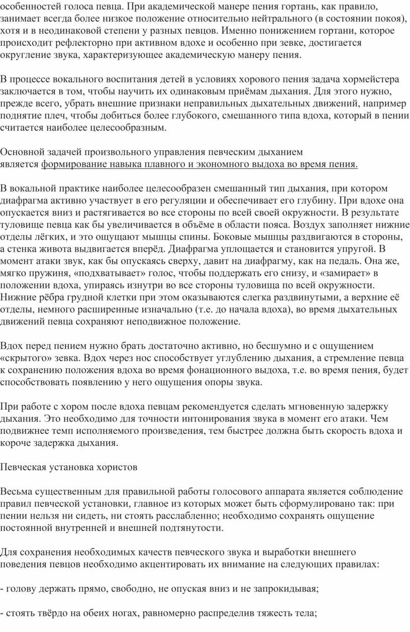 Основной задачей произвольного управления певческим дыханием является формирование навыка плавного и экономного выдоха во время пения.
