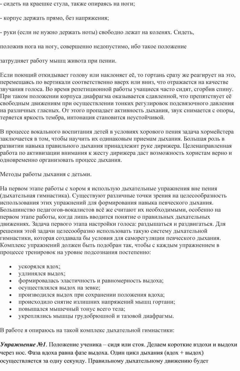 На первом этапе работы с хором я использую дыхательные упражнения вне пения (дыхательная гимнастика). Существуют различные точки зрения на целесообразность использования этих упражнений для формирования навыка певческого дыхания. Большинство педагогов-вокалистов всё же считают их необходимыми, особенно на первом этапе работы, когда лишь вводится понятие о правильных дыхательных движениях. Задача первого этапа настройки голоса: раздышаться и раздвигаться. Для решения этой задачи целесообразно использовать такую систему дыхательной гимнастики, которая создавала бы условия для саморегуляции певческого дыхания. Комплекс упражнений должен быть подобран так, чтобы с каждым упражнением в процессе тренировок на уровне подсознания постепенно: