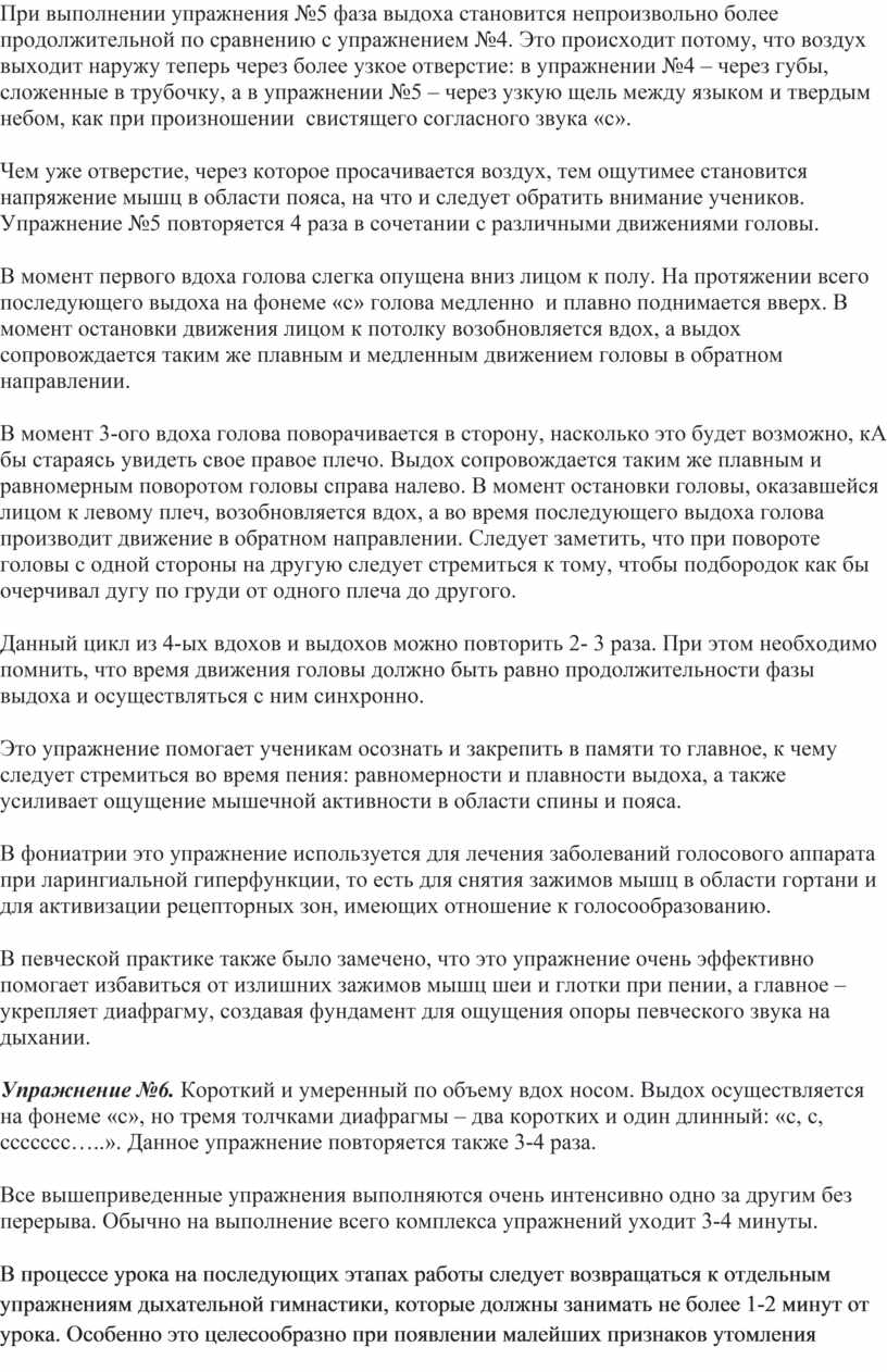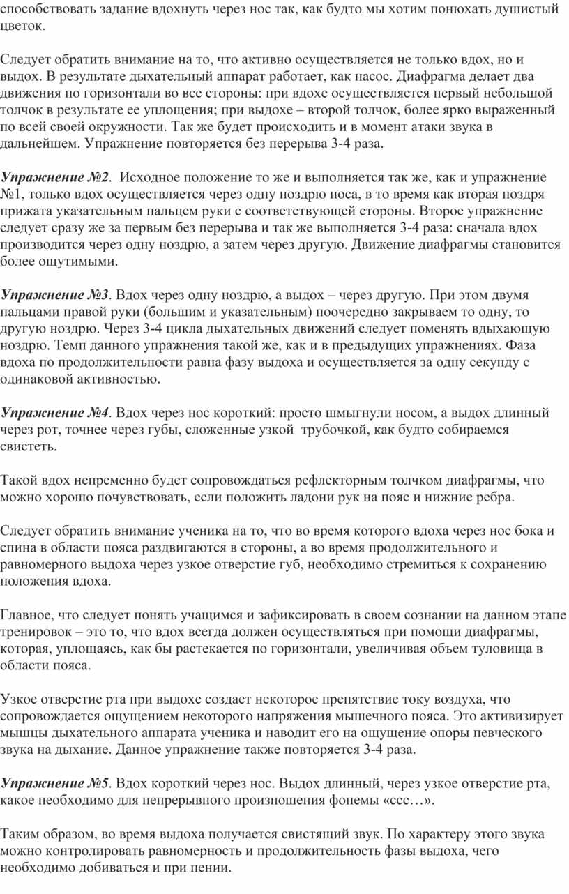 Узкое отверстие рта при выдохе создает некоторое препятствие току воздуха, что сопровождается ощущением некоторого напряжения мышечного пояса. Это активизирует мышцы дыхательного аппарата ученика и наводит его на ощущение опоры певческого звука на дыхание. Данное упражнение также повторяется 3-4 раза.