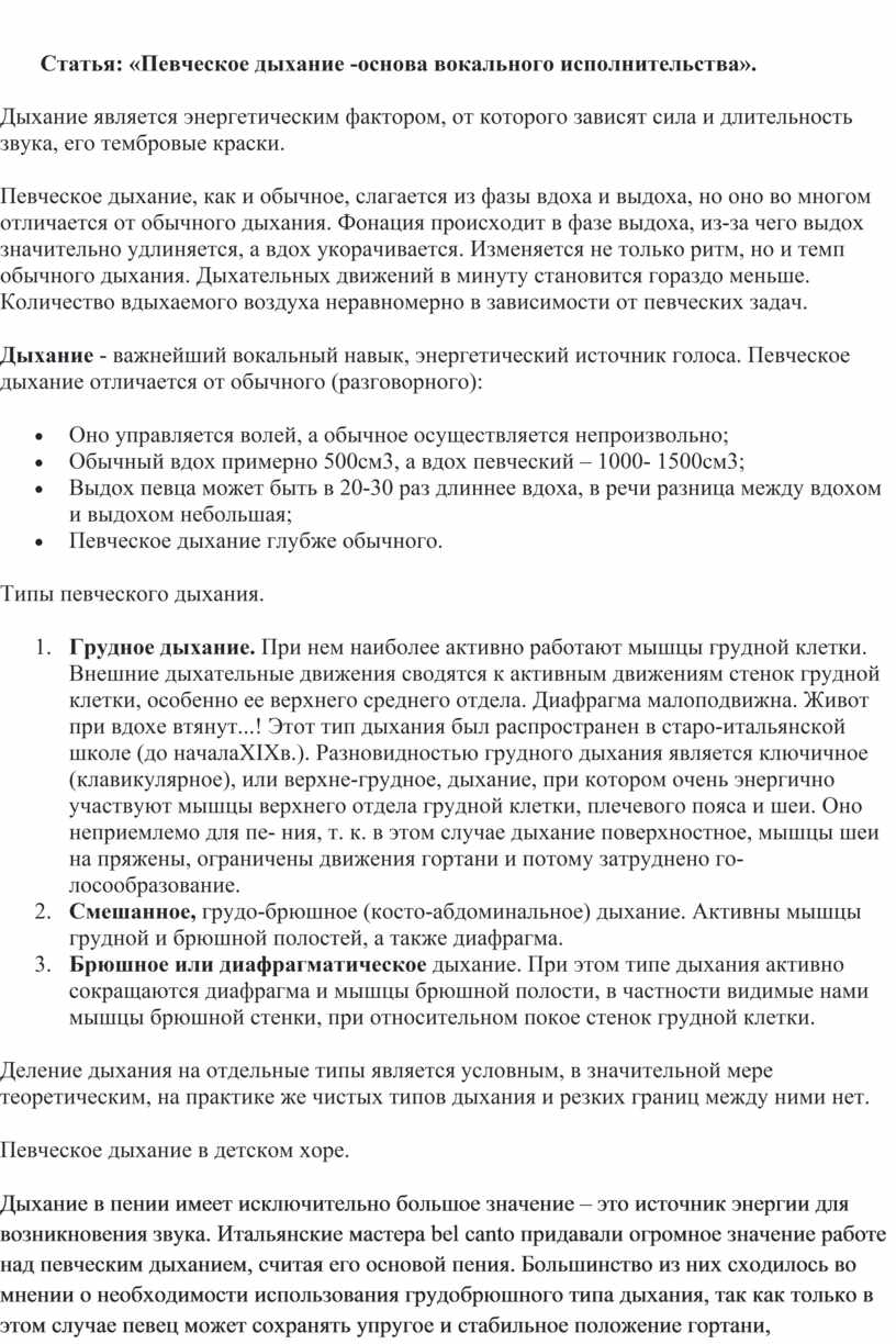 Статья: «Певческое дыхание -основа вокального исполнительства».