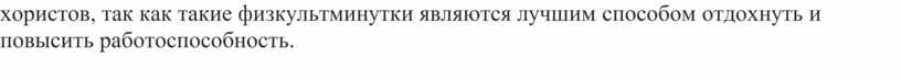 В процессе урока на последующих этапах работы следует возвращаться к отдельным упражнениям дыхательной гимнастики, которые должны занимать не более 1-2 минут от урока. Особенно это целесообразно при появлении малейших признаков утомления хористов, так как такие физкультминутки являются лучшим способом отдохнуть и повысить работоспособность.