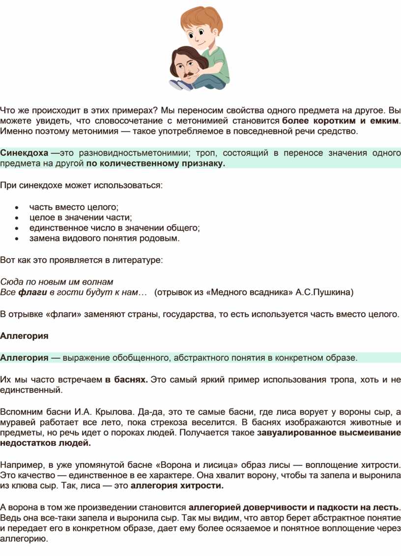 Синекдоха —это разновидностьметонимии; троп, состоящий в переносе значения одного предмета на другой по количественному признаку.