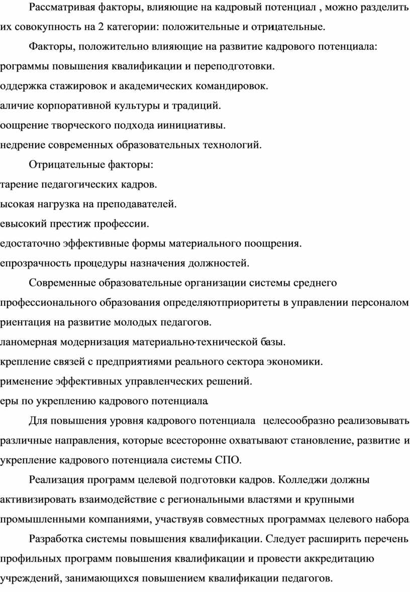 Факторы, положительно влияющие на развитие кадрового потенциала: