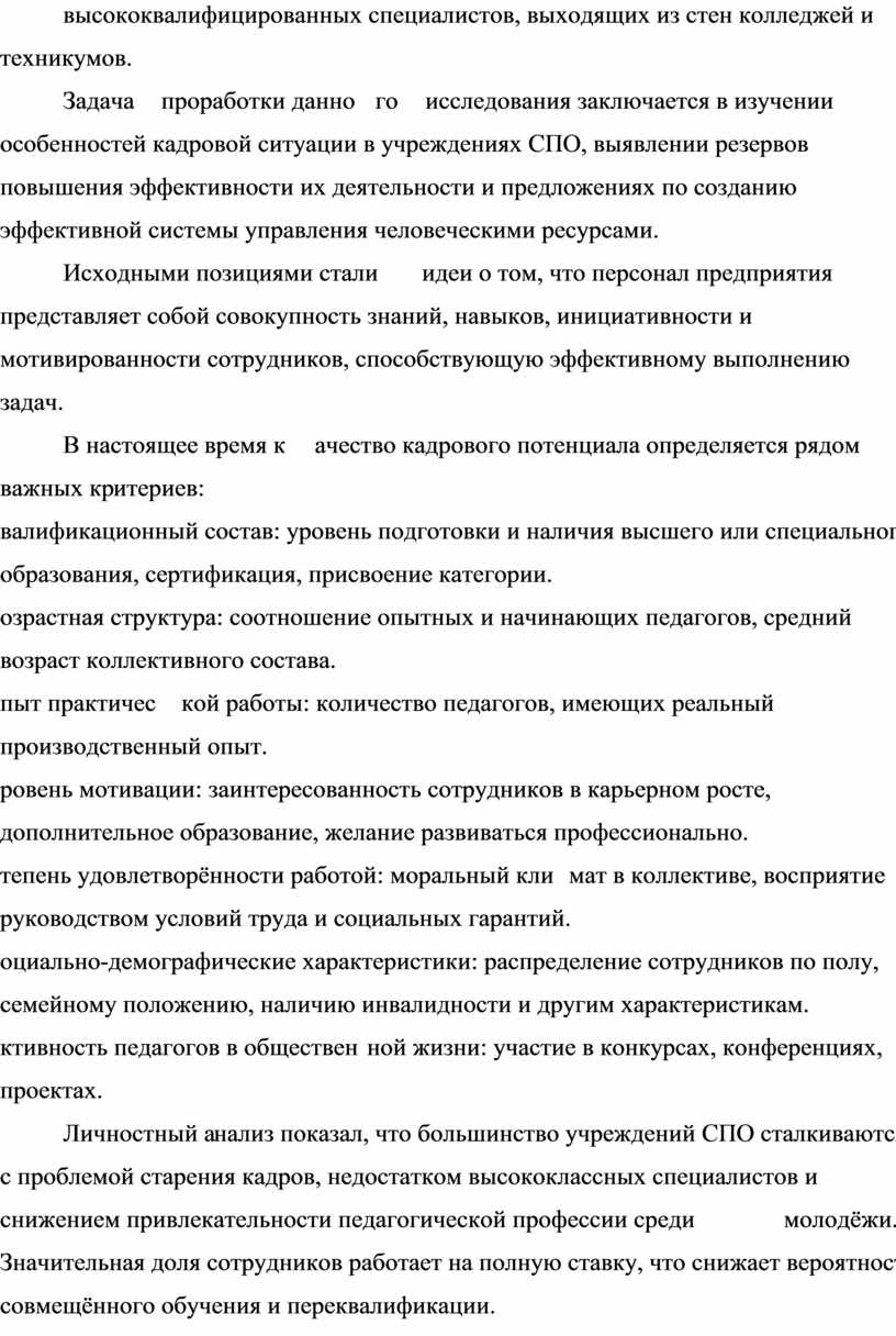 Задача проработки данного исследования заключается в изучении особенностей кадровой ситуации в учреждениях СПО, выявлении резервов повышения эффективности их деятельности и предложениях по созданию эффективной системы управления человеческими ресурсами.