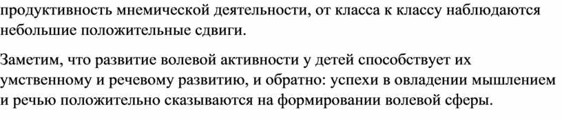 Развитие воли у умственно отсталых школьников, как и других психических функций, – процесс длительный и протекающий замедленно. Однако можно заметить, что у учащихся с интеллектуальной недостаточностью при специальной организации обучения и воспитания постепенно происходят сдвиги в развитии преднамеренных психических процессов – повышается устойчивость и улучшается распределение внимания, увеличивается продуктивность мнемической деятельности, от класса к классу наблюдаются небольшие положительные сдвиги.