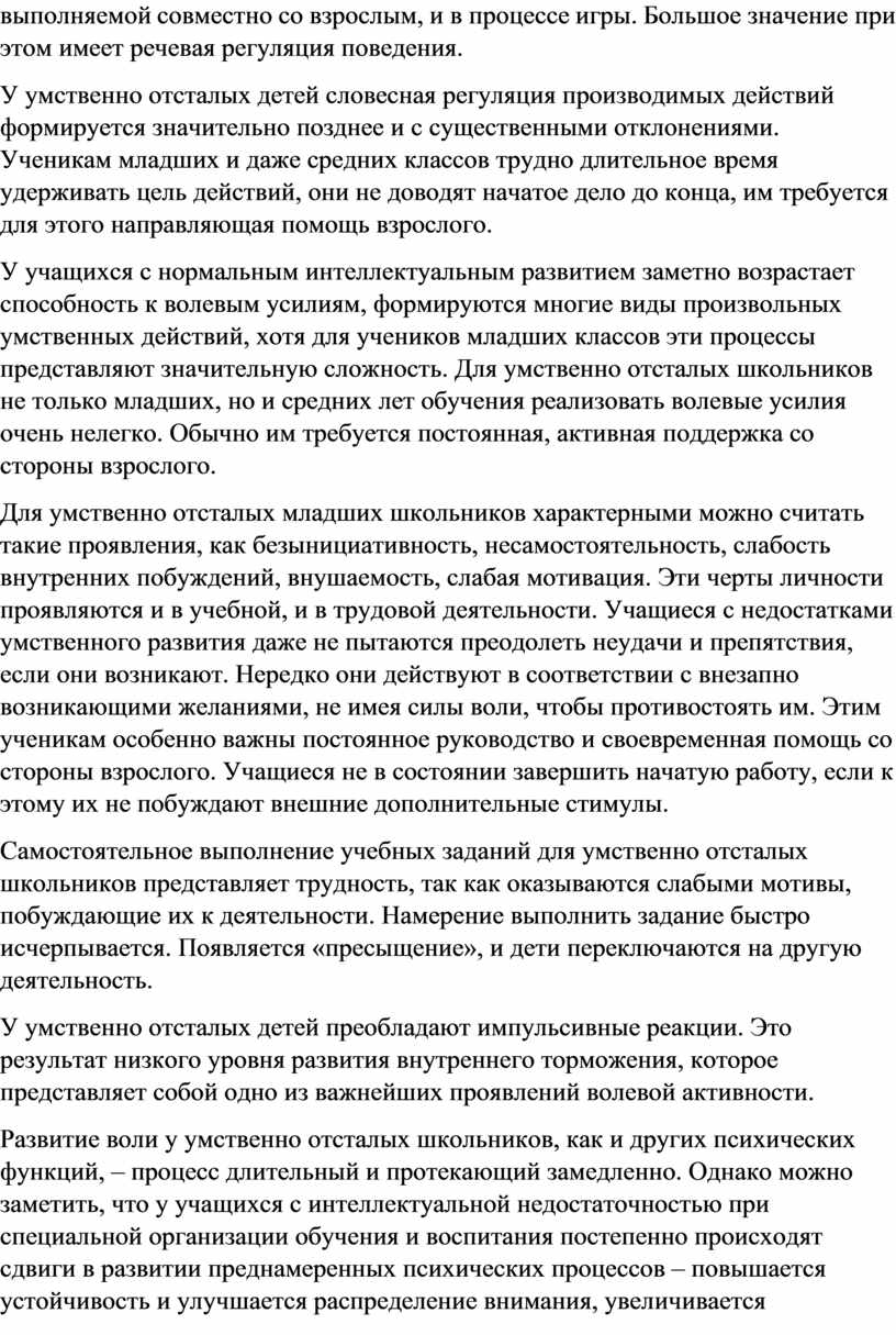 У умственно отсталых детей словесная регуляция производимых действий формируется значительно позднее и с существенными отклонениями. Ученикам младших и даже средних классов трудно длительное время удерживать цель действий, они не доводят начатое дело до конца, им требуется для этого направляющая помощь взрослого.