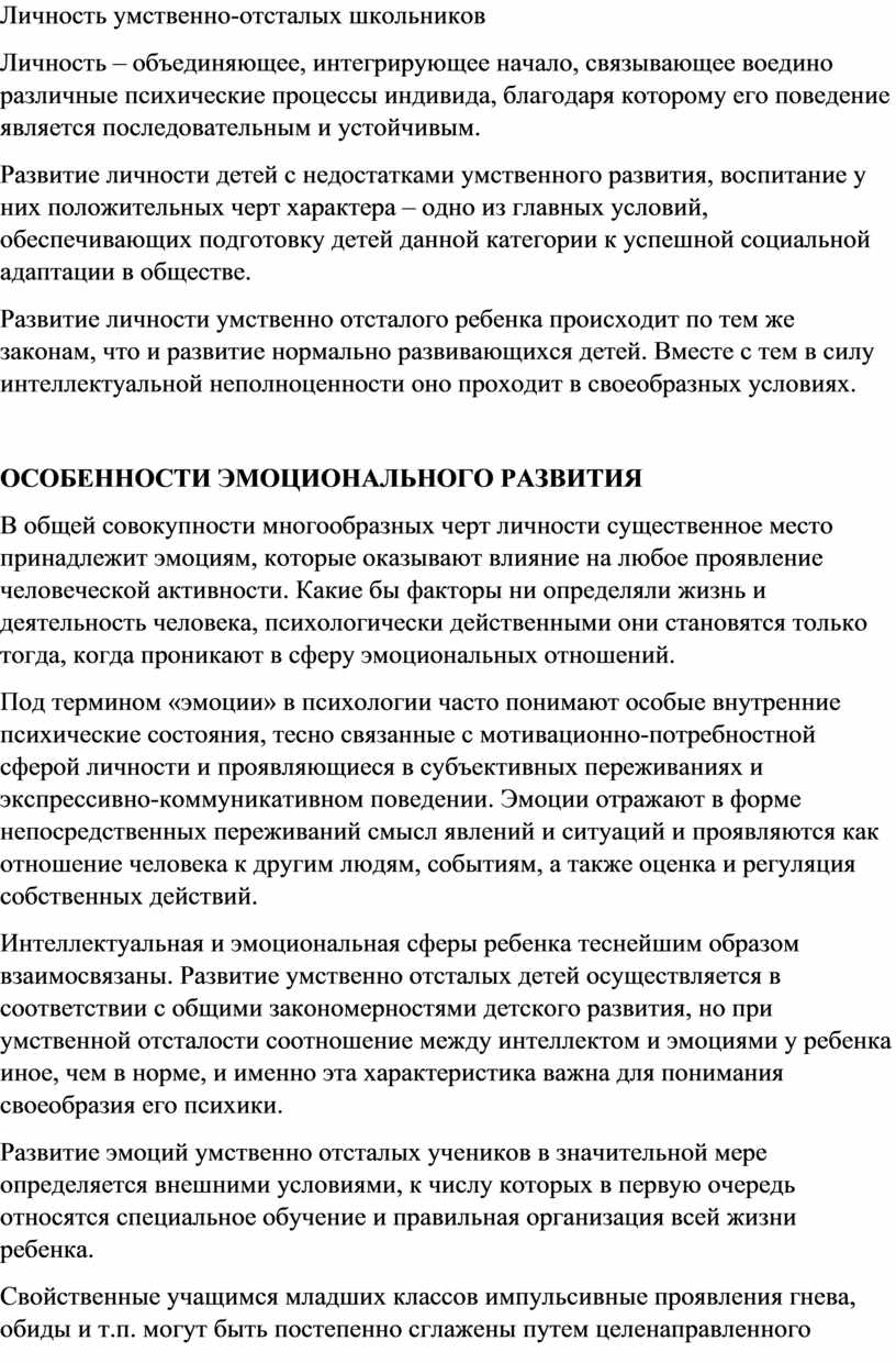 Развитие личности умственно отсталого ребенка происходит по тем же законам, что и развитие нормально развивающихся детей. Вместе с тем в силу интеллектуальной неполноценности оно проходит в своеобразных условиях.