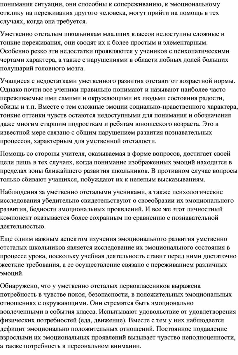 Учащиеся с недостатками умственного развития отстают от возрастной нормы. Однако почти все ученики правильно понимают и называют наиболее часто переживаемые ими самими и окружающими их людьми состояния радости, обиды и т.п. Вместе с тем сложные эмоции социально-нравственного характера, тонкие оттенки чувств остаются недоступными для понимания и обозначения даже многим старшим подросткам и ребятам юношеского возраста. Это в известной мере связано с общим нарушением развития познавательных процессов, характерным для умственной отсталости.