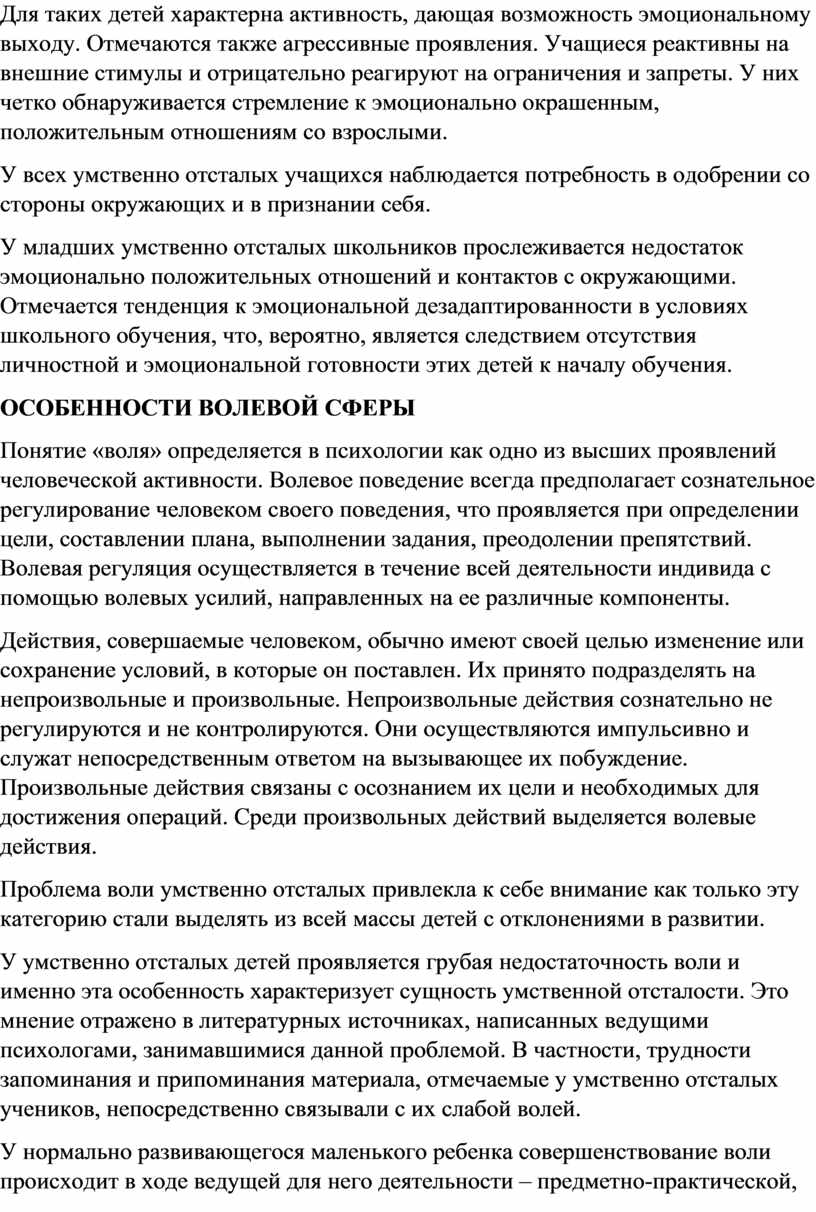 У умственно отсталых детей проявляется грубая недостаточность воли и именно эта особенность характеризует сущность умственной отсталости. Это мнение отражено в литературных источниках, написанных ведущими психологами, занимавшимися данной проблемой. В частности, трудности запоминания и припоминания материала, отмечаемые у умственно отсталых учеников, непосредственно связывали с их слабой волей.