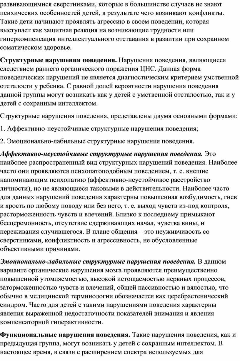 Структурные нарушения поведения. Нарушения поведения, являющиеся следствием раннего органического поражения ЦНС. Данная форма поведенческих нарушений не является диагностическим критерием умственной отсталости у ребенка. С равной долей вероятности нарушения поведения данной группы могут возникать как у детей с умственной отсталостью, так и у детей с сохранным интеллектом.