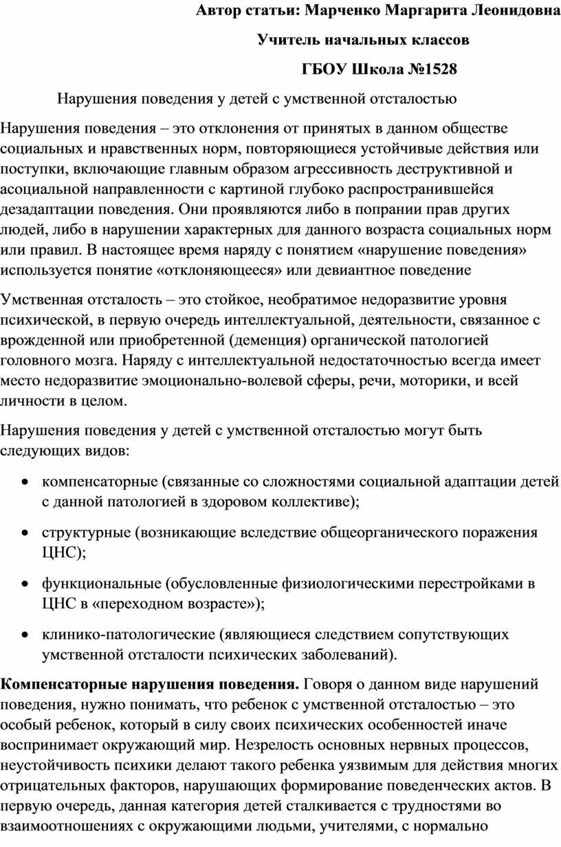 Компенсаторные нарушения поведения. Говоря о данном виде нарушений поведения, нужно понимать, что ребенок с умственной отсталостью – это особый ребенок, который в силу своих психических особенностей иначе воспринимает окружающий мир. Незрелость основных нервных процессов, неустойчивость психики делают такого ребенка уязвимым для действия многих отрицательных факторов, нарушающих формирование поведенческих актов. В первую очередь, данная категория детей сталкивается с трудностями во взаимоотношениях с окружающими людьми, учителями, с нормально развивающимися сверстниками, которые в большинстве случаев не знают психических особенностей детей, в результате чего возникают конфликты. Такие дети начинают проявлять агрессию в своем поведении, которая выступает как защитная реакция на возникающие трудности или гиперкомпенсация интеллектуального отставания в развитии при сохранном соматическом здоровье.