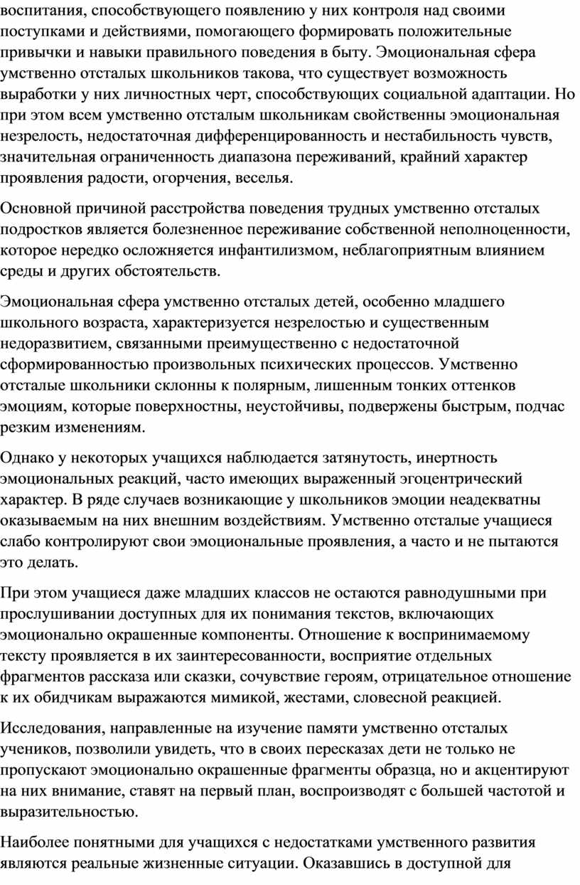Наблюдения за умственно отсталыми учениками, а также психологические исследования убедительно свидетельствуют о своеобразии их эмоционального развития, бедности эмоциональных проявлений. И все же этот личностный компонент оказывается более сохранным по сравнению с познавательной деятельностью.