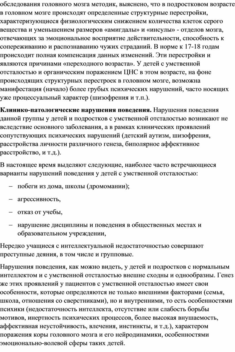 Нарушения поведения, как можно видеть, у детей и подростков с нормальным интеллектом и с умственной отсталостью внешне сходны и однообразны. Генез же этих проявлений у пациентов с умственной отсталостью имеет свои особенности, которые определяются не только внешними факторами (семья, школа, отношения со сверстниками), но и внутренними, то есть особенностями психики (недостаточность интеллекта, отсутствие или слабость борьбы мотивов, инертность психических процессов, более высокая внушаемость, аффективная неустойчивость, влечения, инстинкты, и т.д.), характером поражения коры головного мозга и его нейродинамики, особенностями эмоционально-волевой сферы таких детей.