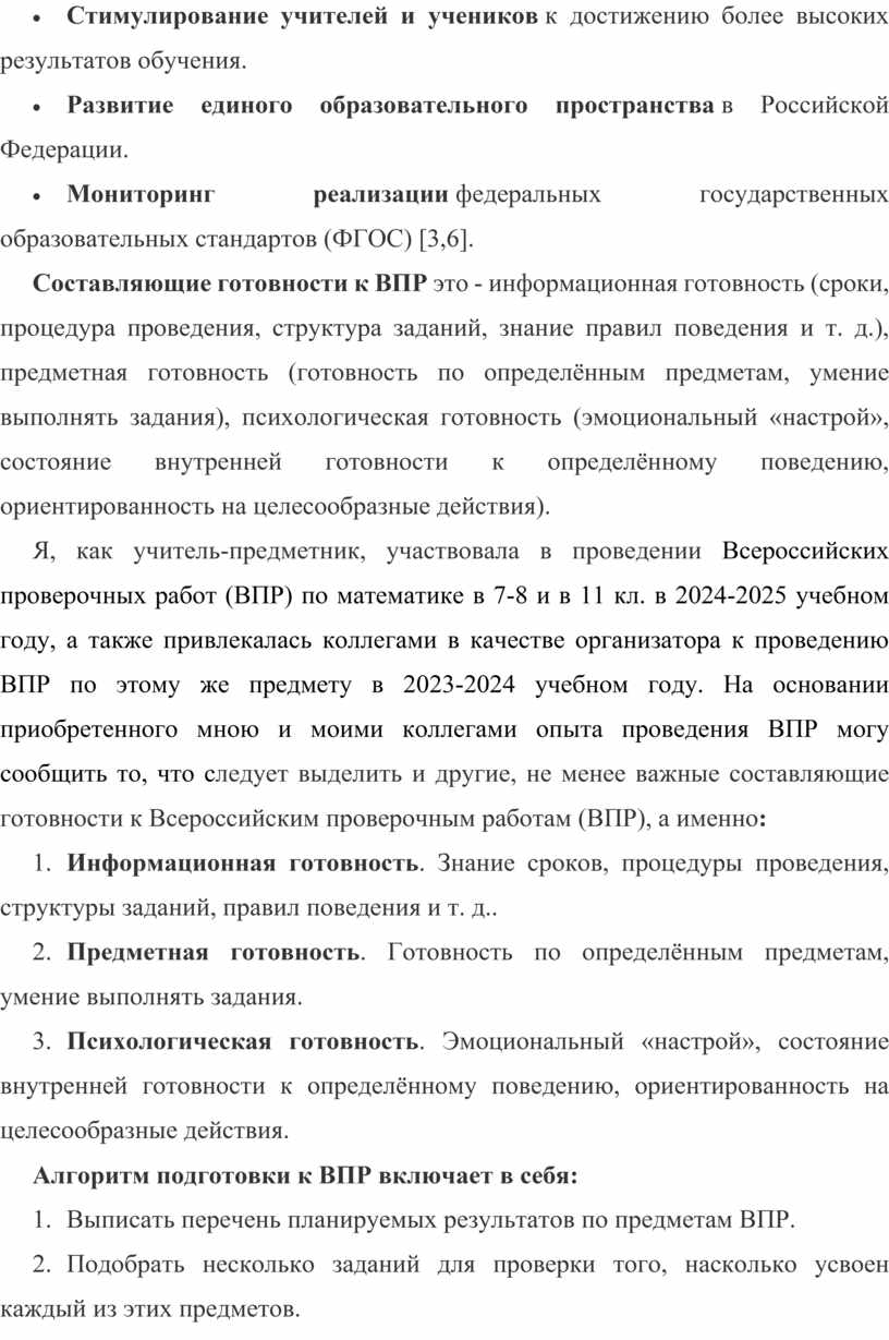 Я, как учитель-предметник, участвовала в проведении Всероссийских проверочных работ (ВПР) по математике в 7-8 и в 11 кл. в 2024-2025 учебном году, а также привлекалась коллегами в качестве организатора к проведению ВПР по этому же предмету в 2023-2024 учебном году. На основании приобретенного мною и моими коллегами опыта проведения ВПР могу сообщить то, что следует выделить и другие, не менее важные составляющие готовности к Всероссийским проверочным работам (ВПР), а именно: