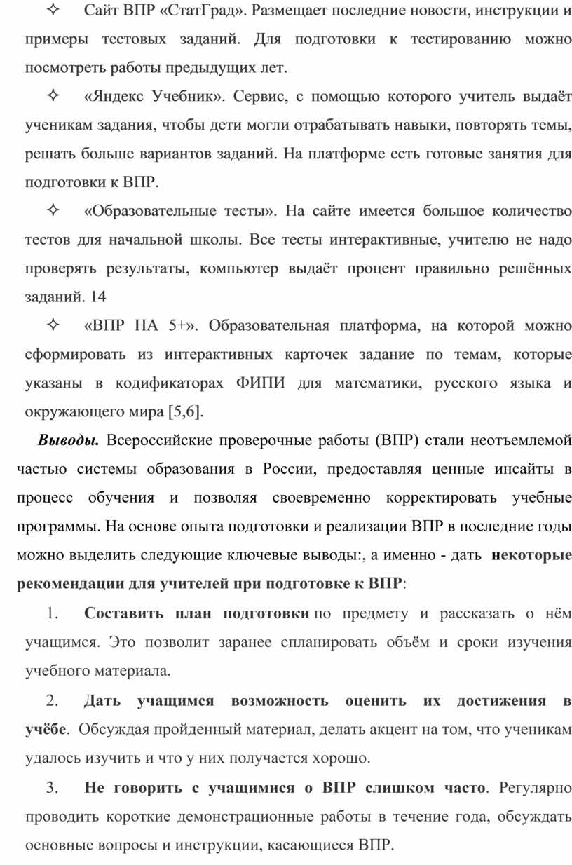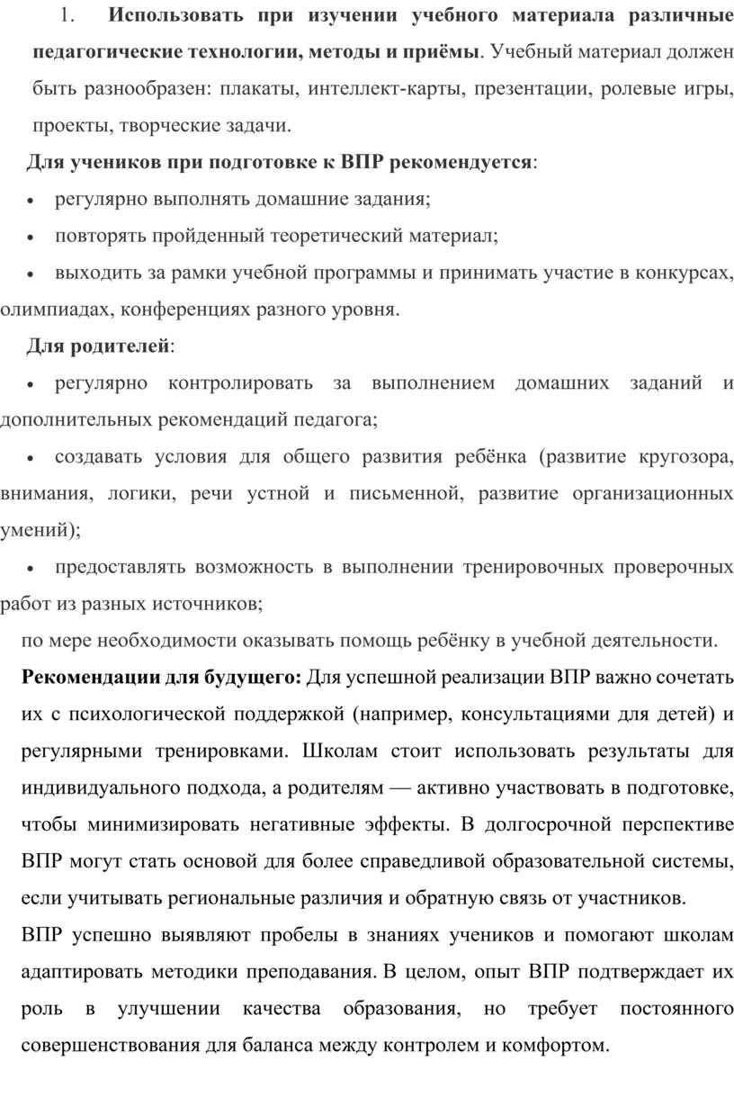 Выводы. Всероссийские проверочные работы (ВПР) стали неотъемлемой частью системы образования в России, предоставляя ценные инсайты в процесс обучения и позволяя своевременно корректировать учебные программы. На основе опыта подготовки и реализации ВПР в последние годы можно выделить следующие ключевые выводы:, а именно - дать некоторые рекомендации для учителей при подготовке к ВПР: