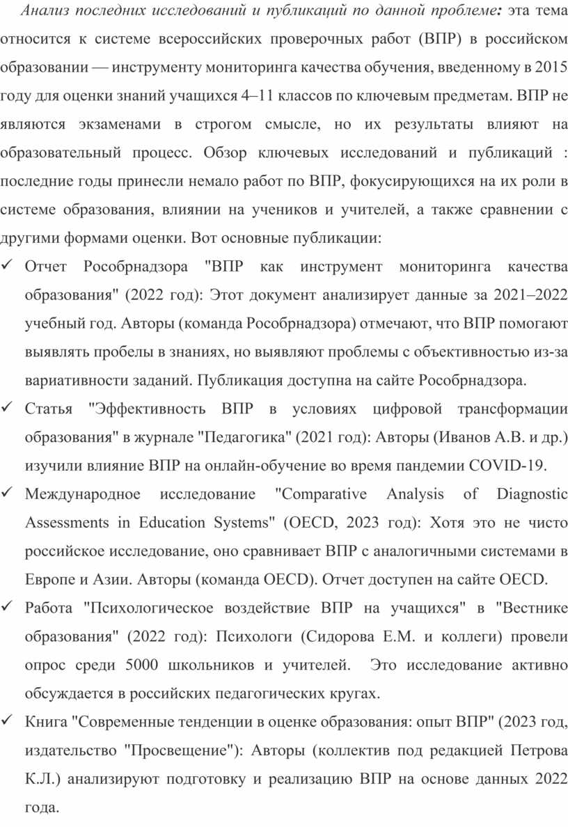 Анализ последних исследований и публикаций по данной проблеме: эта тема относится к системе всероссийских проверочных работ (ВПР) в российском образовании — инструменту мониторинга качества обучения, введенному в 2015 году для оценки знаний учащихся 4–11 классов по ключевым предметам. ВПР не являются экзаменами в строгом смысле, но их результаты влияют на образовательный процесс. Обзор ключевых исследований и публикаций : последние годы принесли немало работ по ВПР, фокусирующихся на их роли в системе образования, влиянии на учеников и учителей, а также сравнении с другими формами оценки. Вот основные публикации:
