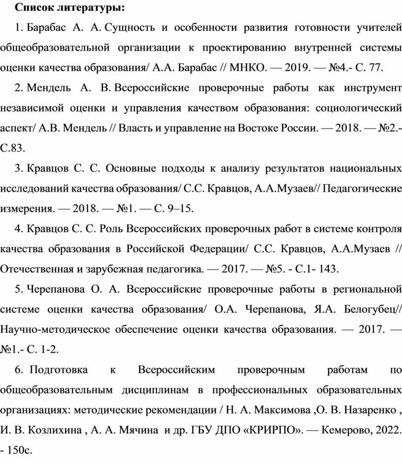 4. Кравцов С. С. Роль Всероссийских проверочных работ в системе контроля качества образования в Российской Федерации/ С.С. Кравцов, А.А.Музаев // Отечественная и зарубежная педагогика. — 2017. — №5. - С.1- 143.