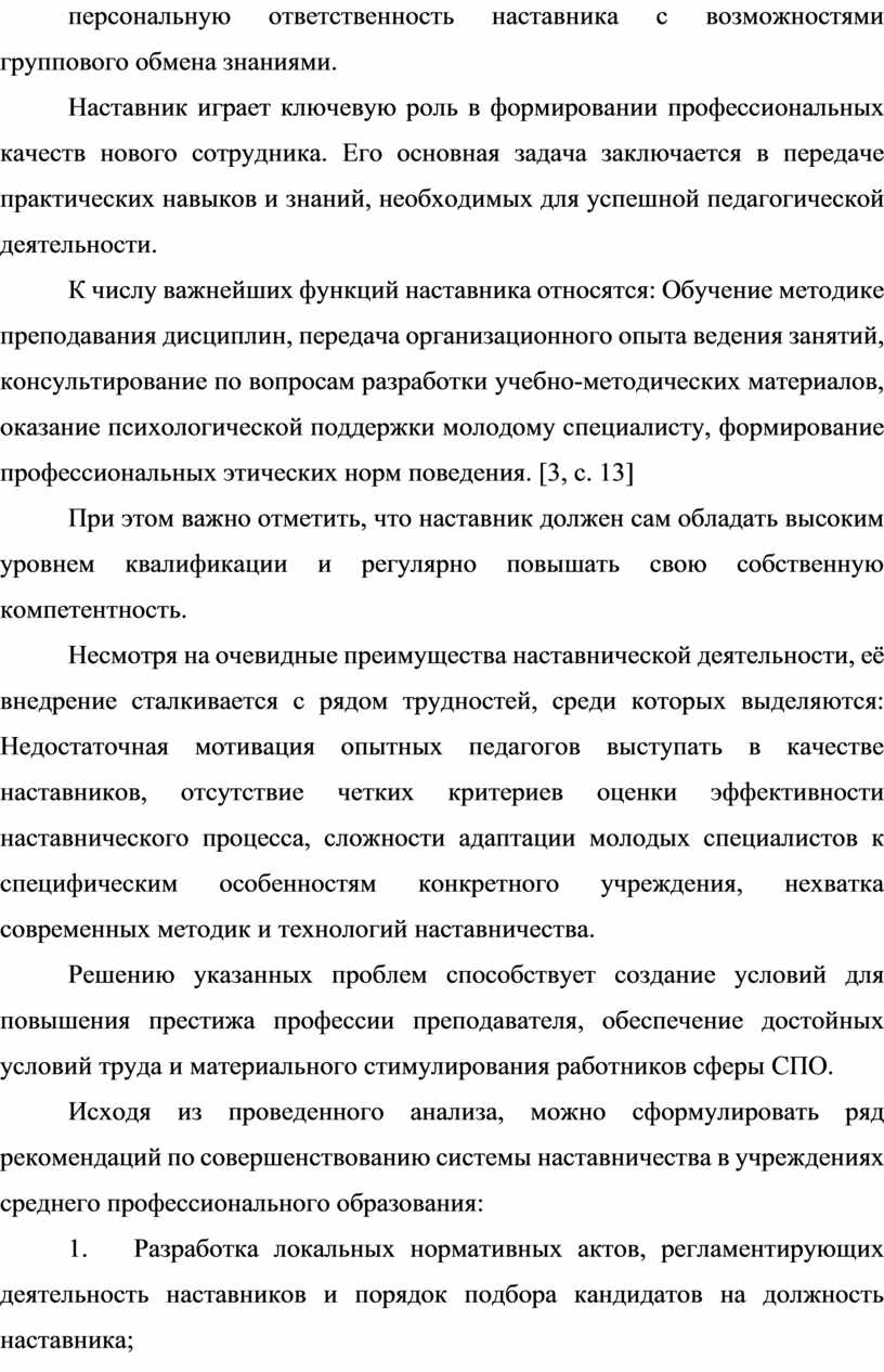 Исходя из проведенного анализа, можно сформулировать ряд рекомендаций по совершенствованию системы наставничества в учреждениях среднего профессионального образования:
