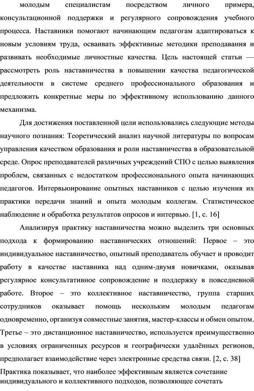 Для достижения поставленной цели использовались следующие методы научного познания: Теоретический анализ научной литературы по вопросам управления качеством образования и роли наставничества в образовательной среде. Опрос преподавателей различных учреждений СПО с целью выявления проблем, связанных с недостатком профессионального опыта начинающих педагогов. Интервьюирование опытных наставников с целью изучения их практики передачи знаний и опыта молодым коллегам. Статистическое наблюдение и обработка результатов опросов и интервью. [1, с. 16]