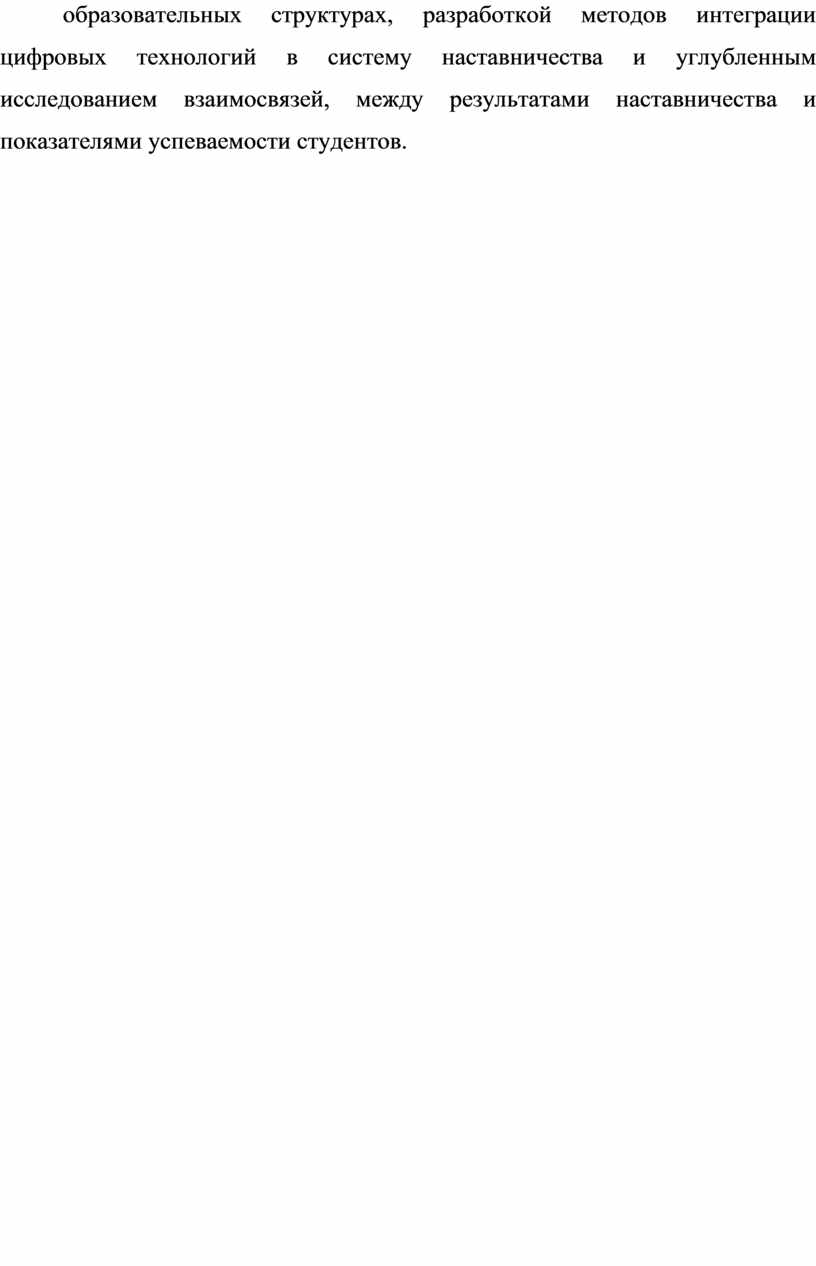 Дальнейшие перспективы исследований связаны с изучением особенностей функционирования модели наставничества в инновационных образовательных структурах, разработкой методов интеграции цифровых технологий в систему наставничества и углубленным исследованием взаимосвязей, между результатами наставничества и показателями успеваемости студентов.