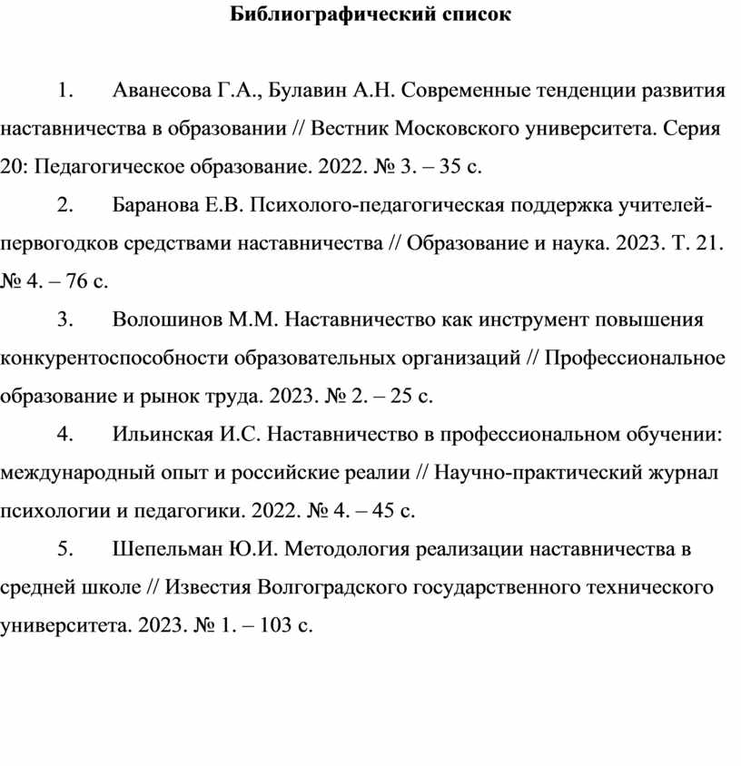 1. Аванесова Г.А., Булавин А.Н. Современные тенденции развития наставничества в образовании // Вестник Московского университета. Серия 20: Педагогическое образование. 2022. № 3. – 35 с.