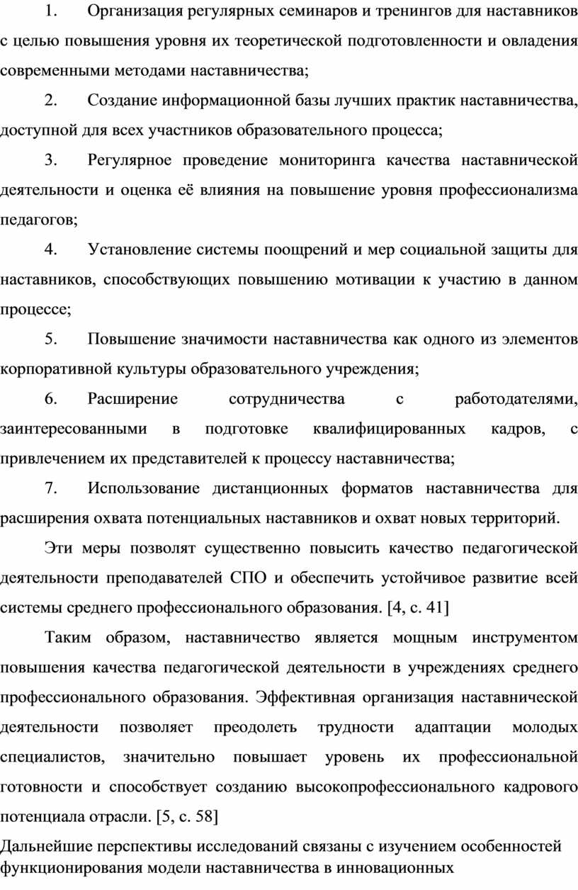 Таким образом, наставничество является мощным инструментом повышения качества педагогической деятельности в учреждениях среднего профессионального образования. Эффективная организация наставнической деятельности позволяет преодолеть трудности адаптации молодых специалистов, значительно повышает уровень их профессиональной готовности и способствует созданию высокопрофессионального кадрового потенциала отрасли. [5, с. 58]